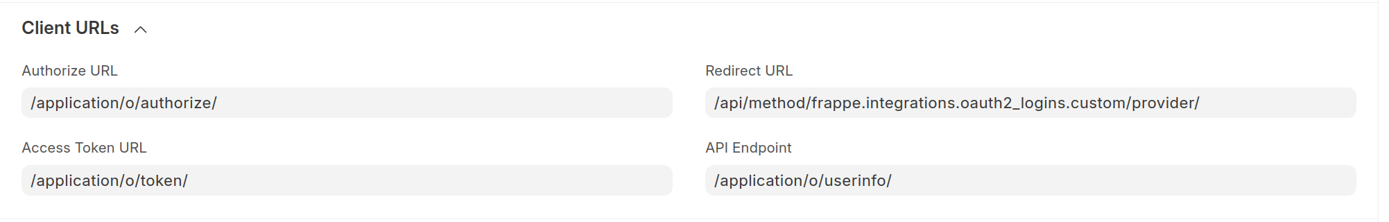 • Redirect URL: https://frappe.company/api/method/frappe.integrations.oauth2_logins.custom/provider